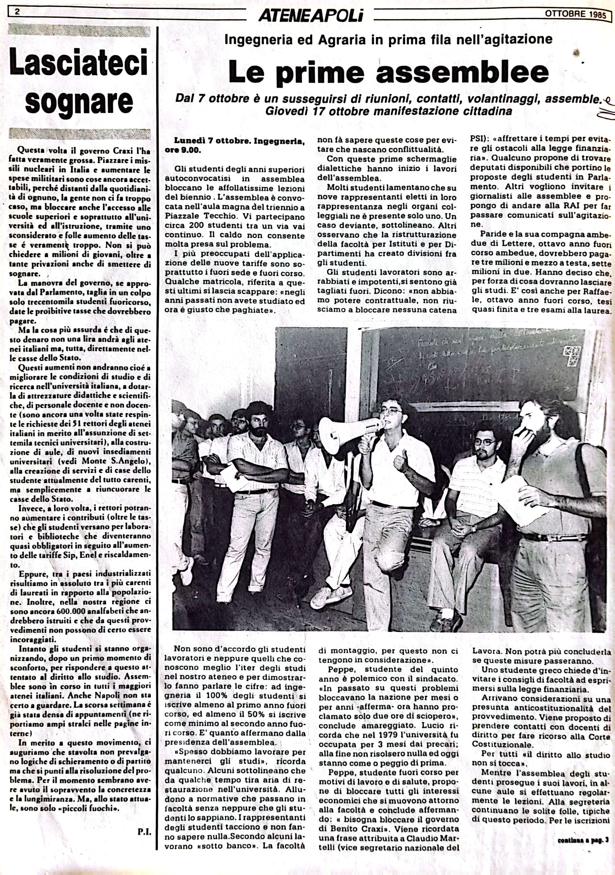 40 Anni Ateneapoli 1985 – Protesta contro la legge finanziaria, studenti in assemblea a Mezzocannone 27/02/1985 0 299 Share FacebookTwitterWhatsAppEmailCopy URL ◼︎ Leggi ora l’articolo dall’archivio di ATENEAPOLI ◼︎ Vai alla pagina dedicata ai 40 anni Share FacebookTwitterWhatsAppEmailCopy URL Previous article1985 – Nasce a Napoli il giornale Ateneapoli, prima iniziativa editoriale in Italia dedicata al mondo universitario. Direttore: Paolo IannottiNext article1985 – Gli studenti protestano contro la legge finanziaria. Facoltà di Ingegneria occupata Desk Due - Advertisement - Articoli Correlati Parthenope “Un valore aggiunto” le classi composte da studenti di Paesi diversi 13/10/2025 Federico II Un “tirocinio extracurriculare a Boston” per alcuni studenti che “stanno vivendo un sogno” 13/10/2025 Federico II Vincenza Ferrara, laurea Magistrale a pieni voti con lode, racconta il suo percorso a Biologia 13/10/2025 Federico II Studi Umanistici e Scienze Sociali: i rappresentanti degli studenti di Link chiedono lo stop agli accordi di ricerca con Israele 13/10/2025 Federico II Emanuela Barone neo Presidente del parlamentino studentesco di Dipartimento 13/10/2025
