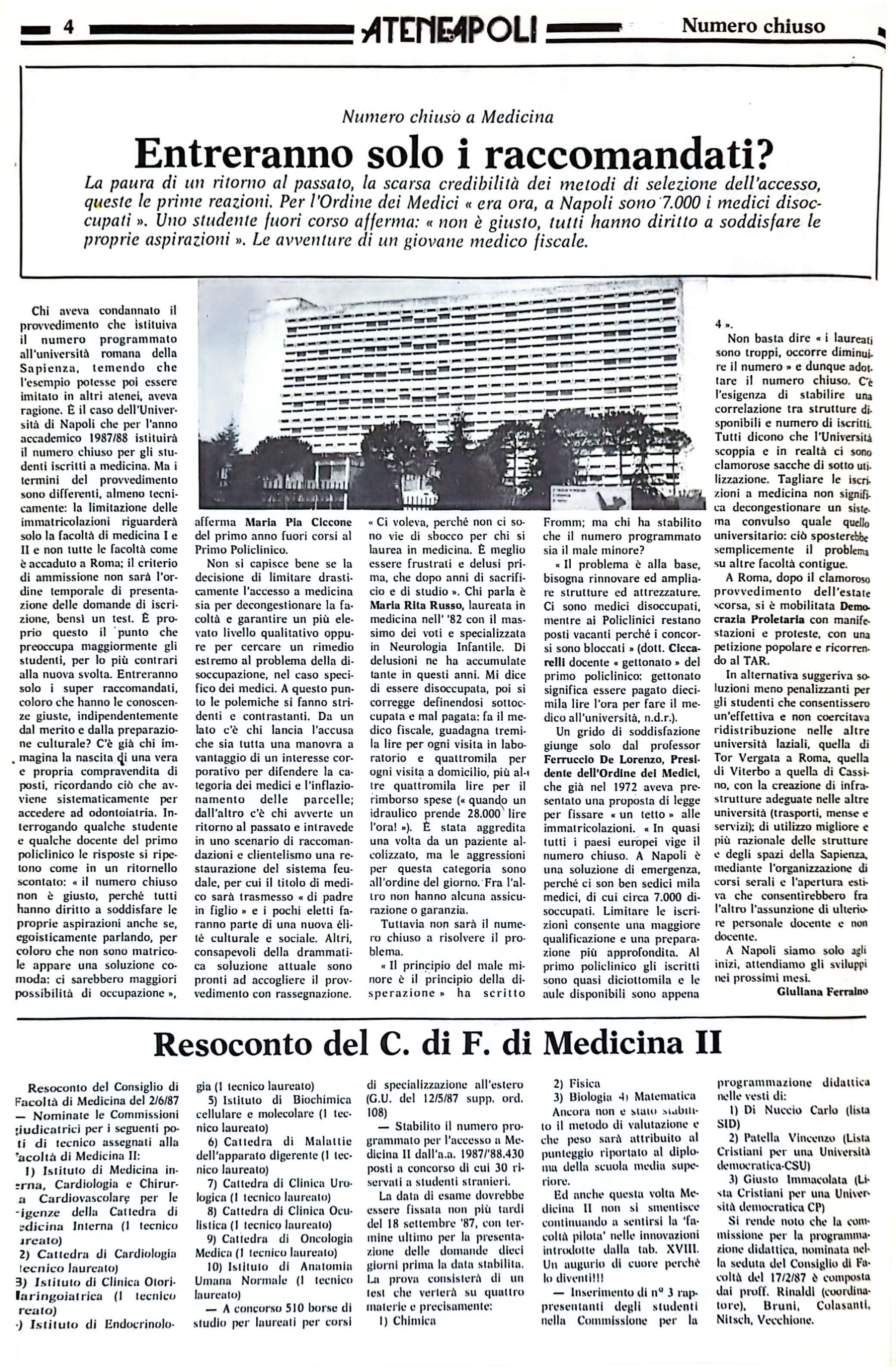 40 Anni Ateneapoli 1987 – Numero chiuso a Medicina, entreranno solo raccomandati? La paura di un ritorno al passato, la scarsa credibilità dei metodi di selezione dell’accesso 04/03/1987 0 236 Share FacebookTwitterWhatsAppEmailCopy URL ◼︎ Leggi ora l’articolo dall’archivio di ATENEAPOLI ◼︎ Vai alla pagina dedicata ai 40 anni Share FacebookTwitterWhatsAppEmailCopy URL Previous article1987 – Il peso dei partiti sulle elezioni studentesche. I candidati non conoscono neppure il programma per cui si presentanoNext article1987 – Il primo passo verso il II° Ateneo viene dall’Università Desk3 - Advertisement - Articoli Correlati Parthenope Nuova composizione degli organi di Ateneo 01/12/2025 Federico II Approccio applicativo al corso di Valutazione della performance aziendale 01/12/2025 Federico II Medicina. “È un percorso con le sue complessità non privo di bellezza” 01/12/2025 Federico II Dipartimento di Architettura. Analisi e Geometria, aule piene ai corsi di tutoraggio 01/12/2025 L. Vanvitelli Il semestre filtro, un motivo in più per scegliere il Corso in inglese 01/12/2025