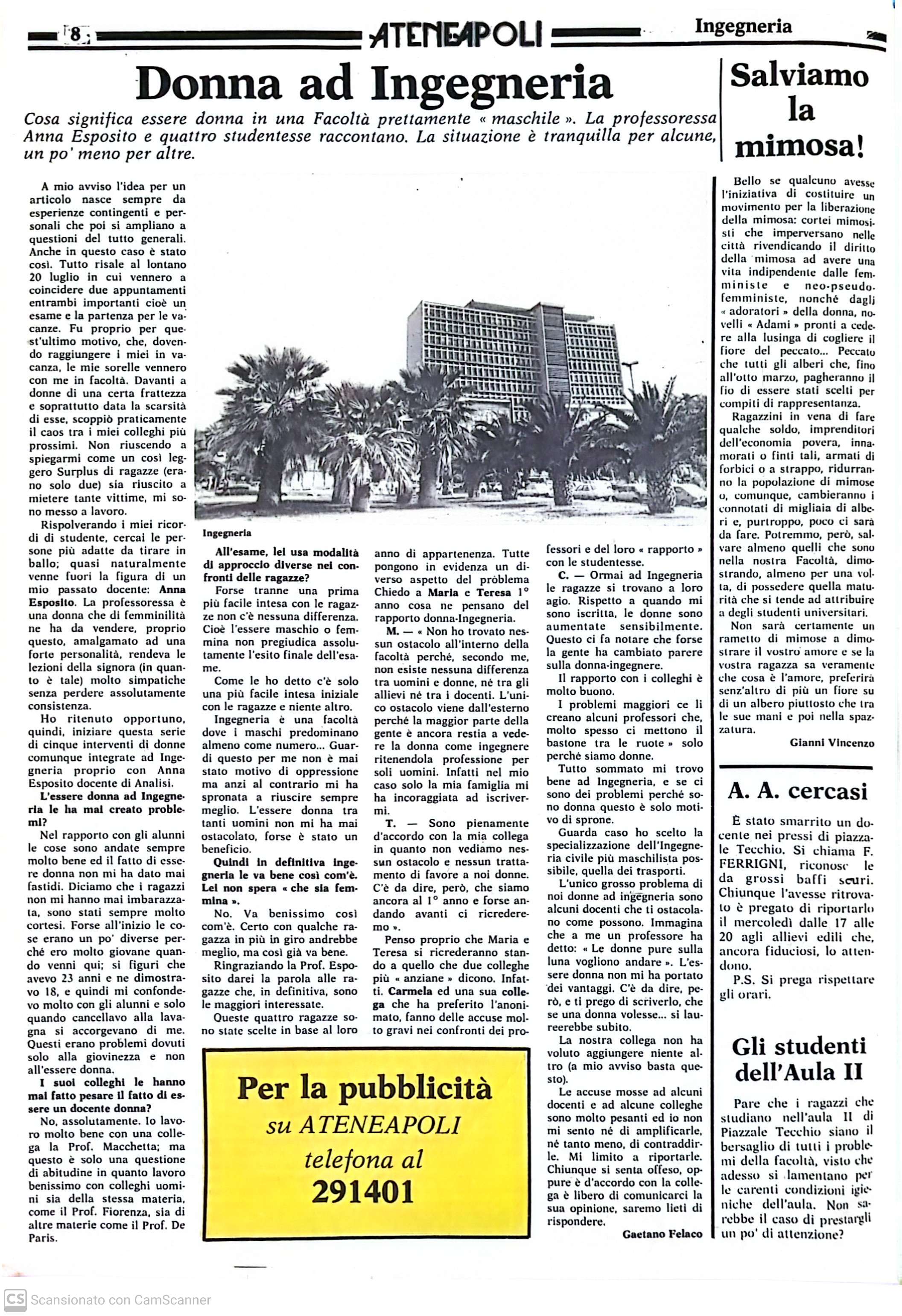 40 Anni Ateneapoli 1988 – Donna ad Ingegneria. Cosa significa essere donna in una Facoltà prettamente “maschile”. La professoressa Anna Esposito e quattro studentesse raccontano. La situazione è tranquilla per alcune un pò meno per altre. 06/03/1988 0 196 Share FacebookTwitterWhatsAppEmailCopy URL ◼︎ Leggi ora l’articolo dall’archivio di ATENEAPOLI ◼︎ Vai alla pagina dedicata ai 40 anni Share FacebookTwitterWhatsAppEmailCopy URL Previous article1988 – La mappa del potere ad Ingegneria. Il nucleo centrale sono gli elettrici. Diverse aree scientifiche della facoltà. Comanda la sinistra. In ascesa gli elettronici.Next article1988 – Sociologia cambia sede. L’ex edificio della Facoltà di Farmacia in Via Rodinò ospiterà gli studenti di Sociologia. Una sede finalmente per un Corso di Laurea che da anni è in cerca di una sistemazione non provvisoria. Desk3 - Advertisement - Articoli Correlati Attualità Elezioni Rettore Federico II. Andrea Mazzucchi ufficializza la candidatura con “un progetto condiviso” 15/10/2025 L'Orientale Cleodicee, “voglio rendere il mondo un posto migliore per le donne” 15/10/2025 Elezioni Rettore Elezione del Rettore all’Università di Napoli “Federico II” 15/10/2025 Attualità Elezioni Rettore Federico II. Ufficializzata la prima candidatura: è quella del prof. Santolo Meo 15/10/2025 L. Vanvitelli “Laurearsi giovani è un investimento che rende” 15/10/2025