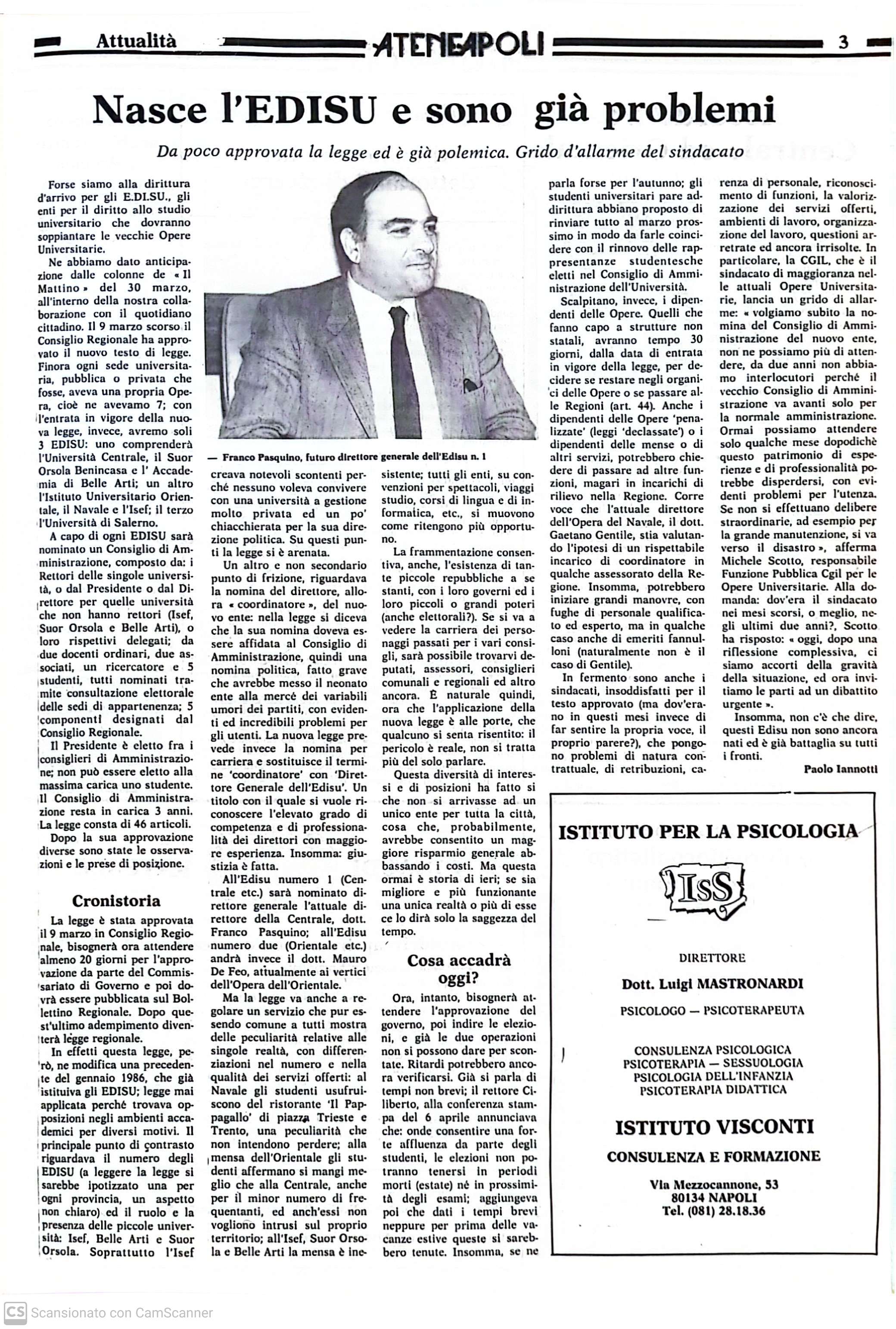 40 Anni Ateneapoli 1988 – Nasce l’EDISU e sono già problemi. Da poco approvata la legge ed è già polemica. Grido d’allarme del sindacato. 10/03/1988 0 163 Share FacebookTwitterWhatsAppEmailCopy URL ◼︎ Leggi ora l’articolo dall’archivio di ATENEAPOLI ◼︎ Vai alla pagina dedicata ai 40 anni Share FacebookTwitterWhatsAppEmailCopy URL Previous article1988 – In agitazione i professori associati: “Pari noi siamo! “Trattamento economico e pratiche concorsuali sotto accusa. Assemblee a Napoli e Roma sulla questione. Numerosi i ricorsi avanzati al TAR. 1500 docenti di “seconda fascia” in fermento nelle Università napoletane.Next article1988 – Medical Dynasty. Cattedre per discendenza. Desk3 - Advertisement - Articoli Correlati Attualità Elezioni Rettore Federico II. Andrea Mazzucchi ufficializza la candidatura con “un progetto condiviso” 16/10/2025 Attualità Un docente-scrittore, Gionata De Vico 16/10/2025 Attualità Elezioni Rettore Federico II. Ufficializzata la prima candidatura: è quella del prof. Santolo Meo 15/10/2025 L'Orientale Cleodicee, “voglio rendere il mondo un posto migliore per le donne” 15/10/2025 Elezioni Rettore Elezione del Rettore all’Università di Napoli “Federico II” 15/10/2025