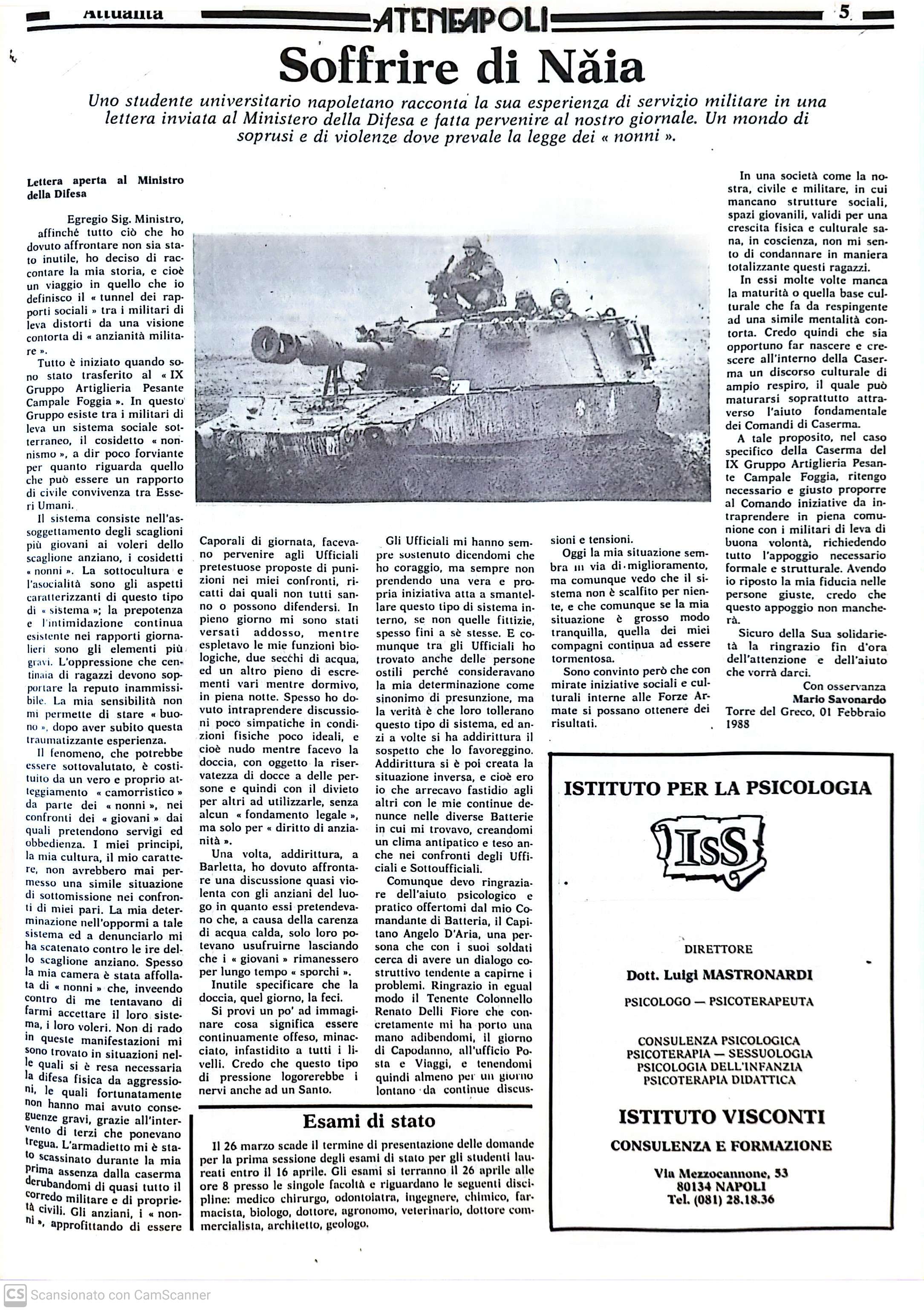 1988 – Soffrire di Naia. Uno studente universitario napoletano racconta la sua esperienza di servizio militare in una lettera inviata al Ministero della Difesa e fatta pervenire al nostro giornale. Un mondo di soprusi e di violenze dove prevale la legge dei “nonni”.