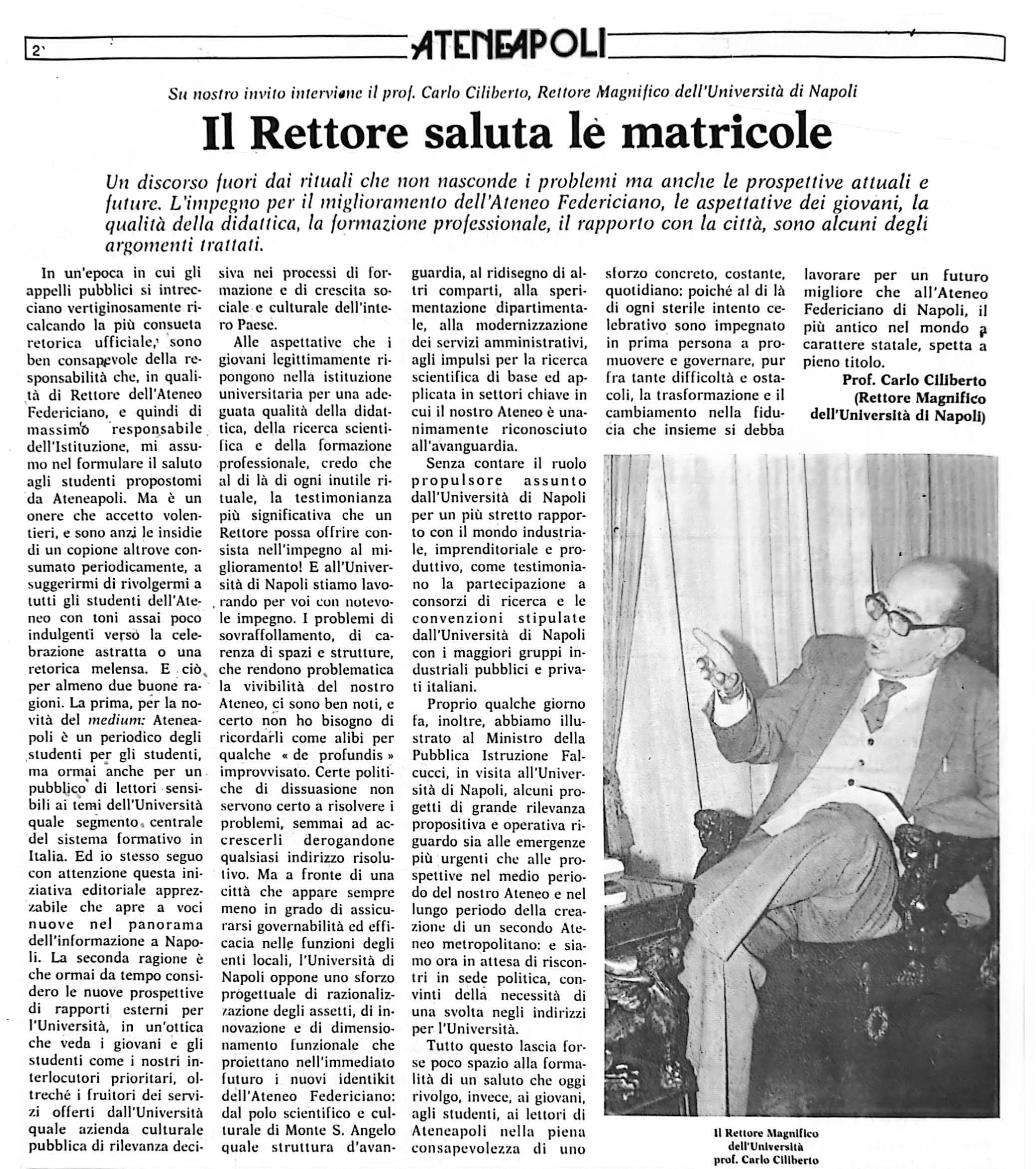 40 Anni Ateneapoli 1986 – Il Rettore Carlo Ciliberto saluta le sue matricole. Un discorso fuori dai rituali che non nasconde problemi ma anche prospettive attuali e future 03/03/1986 0 244 Share FacebookTwitterWhatsAppEmailCopy URL ◼︎ Leggi ora l’articolo dall’archivio di ATENEAPOLI ◼︎ Vai alla pagina dedicata ai 40 anni Share FacebookTwitterWhatsAppEmailCopy URL Previous article1986 – L’Università dei “Figli di papà”. Intervista ai figli dei nomi noti dell’Università di NapoliNext article1986 – Medicina I a Cappella Cangiani. Stanziati 36 miliardi per la riattazione di S. Andrea delle Dame e S. Patrizia Desk3 - Advertisement - Articoli Correlati Parthenope “Un valore aggiunto” le classi composte da studenti di Paesi diversi 13/10/2025 Federico II Un “tirocinio extracurriculare a Boston” per alcuni studenti che “stanno vivendo un sogno” 13/10/2025 Federico II Vincenza Ferrara, laurea Magistrale a pieni voti con lode, racconta il suo percorso a Biologia 13/10/2025 Federico II Studi Umanistici e Scienze Sociali: i rappresentanti degli studenti di Link chiedono lo stop agli accordi di ricerca con Israele 13/10/2025 Federico II Emanuela Barone neo Presidente del parlamentino studentesco di Dipartimento 13/10/2025