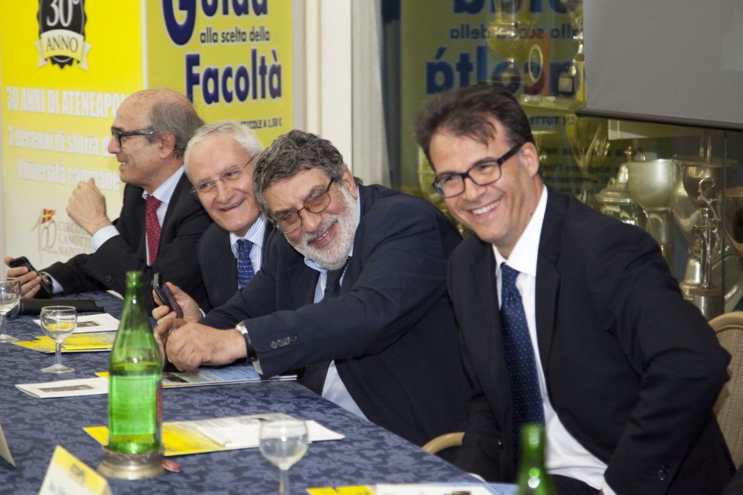 Trent’anni di emozioni, sfide, cambiamenti e verità raccontate. Una vita per gli studenti che sono cresciuti con il giornale, una fase della carriera per i tanti Rettori, Presidi e docenti che si sono avvicendati, un sogno per un sociologo neolaureato. I pilastri delle Università campane si sono riuniti il 4 giugno al Circolo Canottieri di Napoli, che si è vestito a festa. L’occasione: il compleanno di Ateneapoli, il nostro quindicinale giallo e nero, che ha raccontato la storia degli Atenei, ed è entrato nel cuore e nelle case di tantissimi lettori ed abbonati. Apre il Presidente del Circolo Edoardo Sabbatino: “quest’anno festeggiamo i cento del nostro Circolo e i 30 anni di Ateneapoli. Per noi è un onore ospitare una rivista che si è affermata sempre più per qualità e necessità di fornire informazioni agli studenti. La vicinanza e l’attenzione a questi ultimi, la dimostriamo aderendo ad un progetto di tutoraggio per i nostri campioni, che, causa impegni sportivi, hanno poco tempo per studiare”. La parola passa al Direttore Gennaro Varriale, che racconta ciò che è stato Ateneapoli, attraverso la proiezione delle foto dei momenti più belli: “questo periodico nasce con l’intento di essere un servizio e un mezzo di comunicazione per gli studenti, prima di tutto, ed in secondo luogo per le altre categorie presenti nell’Università. Vuole diventare utile strumento di informazione e comunicazione per il popolo dei 100.000 che ogni giorno invade le strutture degli Atenei napoletani. Nonché di confronto su quelle che saranno le scelte in futuro, e strumento divulgativo, per una serie di studi e progetti che altrimenti rimarrebbero nelle segrete stanze degli studiosi”, le parole del fondatore Paolo Iannotti, riportate nell’editoriale del numero zero, danno un’idea della missione del giornale. “Frutto dell’idea di un ex studente, che da non molto tempo aveva lasciato i banchi dell’università e che già allora sentiva l’assenza di un mezzo di comunicazione che permettesse di avere notizie fuori dal recinto del proprio Corso di Laurea. Un compito certamente non facile, ma al quale crediamo”, continua a citare Varriale. “Il ventisettenne da poco laureato ci ha creduto e ha dato vita ad una realtà unica: un numero zero di fogli gialli e neri, nato nel febbraio dell’85. In trent’anni: sette milioni di copie distribuite, 573 numeri, 150.000 interviste e 240 collaboratori avvicendatisi. Piccoli passi con pochi fondi”, prosegue. Tante le manifestazioni promosse nel corso del tempo: edizioni di Miss Università, concerti e premi letterari, con ospiti del mondo della cultura e dello spettacolo, da Piero Chiambretti a Paolo Hendel, da Alessandro Siani a Peppe Barra, dai registi Francesco Apolloni e Eduardo Tartaglia, al compianto Giorgio Gaber.
