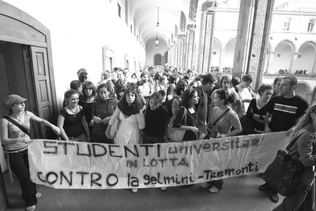 Sono ormai trascorse almeno due ore di assemblea, e una rappresentante degli studenti porta il punto di vista dei ragazzi riuniti in assemblea permanente: “siamo stanchi del sostegno dei docenti a titolo personale, ci stiamo riunendo dai primi di settembre e finora non è venuto nessuno, mentre il resto d’Italia è già attivo nelle proteste. La vostra risposta è lenta. Vi chiediamo due cose: di scioperare e di indire un Consiglio di Facoltà straordinario che abbia all’ordine del giorno il blocco della didattica, una condizione che per noi è punto di partenza e non di arrivo”. L’intervento degenera poi in uno scontro acceso docenti-studenti, finché non arriva l’intervento del prof. Barbagallo a offrire nuove prospettive: “è necessaria una giusta analisi per impostare un giusto metodo di lotta. Come Facoltà di Lettere, noi dai privati non avremo mai niente. Sono quarant’anni che stiamo a fare occupazioni, e che blocchiamo la didattica, nessuno se ne importerà, anzi quello che vogliono è proprio questo: vogliono uccidere il pensiero critico, che è l’unica cosa che possiamo offrire”. Un punto di vista che viene poi completato dal prof. Borrelli: “negli ultimi anni i docenti non hanno fatto nulla per riformarsi, e questa legge ci prende di petto, con intenzioni ben precise da parte di chi l’ha promossa; siamo molto in ritardo, gli studenti si sono mossi prima e sono su posizioni decisamente più avanzate, anche nel documento. Dobbiamo procedere ad una richiesta di ritiro della 133, annunciando contemporaneamente un laboratorio pubblico in cui docenti e studenti possano discutere della legge e capire che tipo di risposte poter approntare, aderendo contemporaneamente a tutte le manifestazioni in ambito cittadino e nazionale. Ci prepariamo alla lotta”.