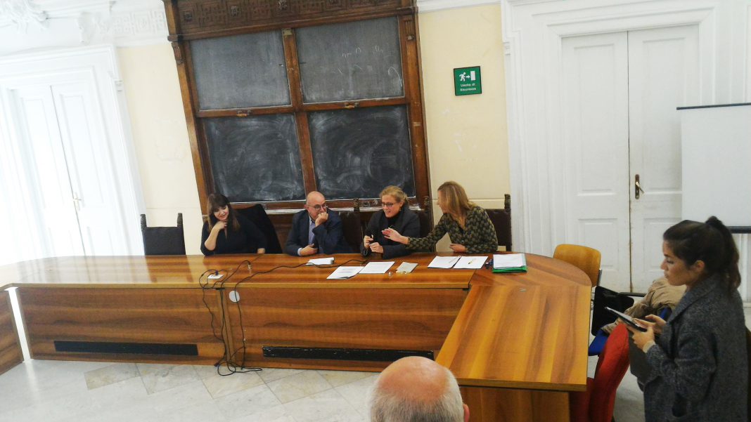 Un’operaia che lavora in una fabbrica di “borze”, che considera benefattore “O masto”, il capo, anche se la sfrutta, che alterna il dialetto napoletano all’italiano scorretto. Si scrive Rosalia Porcaro, si legge Veronica, personaggio divenuto celebre con la trasmissione comica TeleGaribaldi per il modo ironico di rappresentare una condizione lavorativa difficile. L’attrice comica e cabarettista napoletana è stata accolta dal Dipartimento di Scienze Politiche in occasione dell’incontro “Le donne del sud nel mercato del lavoro”, tenutosi il 28 novembre in un’aula Spinelli, a via Rodinò, riempita per metà dagli studenti. “Quello di oggi è un incontro sui generis che ci offre uno spunto di riflessione su tematiche che affrontiamo spesso nelle nostre aule”, ha esordito il Direttore di Dipartimento Marco Musella. Obiettivo della giornata: “approfondire il tema del mondo del lavoro con particolare riguardo a quello femminile nel Mezzogiorno. C’è un divario forte tra uomini e donne, anche se queste ultime hanno reagito meglio ai cambiamenti degli ultimi tempi”. Senso dell’appuntamento è “darvi elementi di forza per interpretare con impegno la strada che vi porterà a realizzarvi professionalmente. Il lavoro è una forma di identità che ci consente di essere persone degne di tale nome”. Si cercano spunti dal personaggio di Veronica: “è una donna che lavora in una fabbrica di borse, un settore del Made in Italy spiazzato dalla globalizzazione. Veronica non ha studiato troppo e fa errori nel parlare. È un personaggio simpatico che ci fa riflettere sulle condizioni di difficoltà professionale”. Difficoltà che conosce bene un’operaia “regolarmente inquadrata a nero”. Così ha esordito la Porcaro strappando le risate dei presenti. Lo sketch è poi proseguito: “il posto fisso…