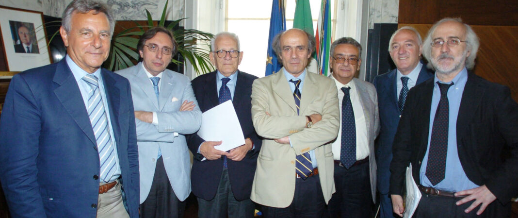 I Rettori campani si riuniscono alla Federico II (anno 2005): Gennaro Ferrara (Univ. Parthenope), Lucio d’Alessandro (Univ. Suor Orsola Benincasa), Antonio Grella (Seconda Università – Vanvitelli), Guido Trombetti (Univ. Federico II), Aniello Cimitile (Univ. Sannio), Raimondo Pasquino (Univ. Salerno), Pasquale Ciriello (L’Orientale). Foto archivio ATENEAPOLI