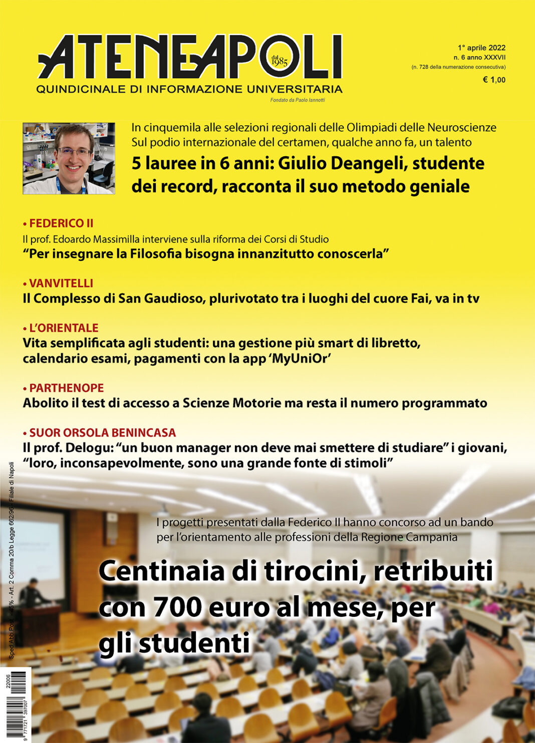 Giornale 2022 (anno XXXVII) Num. 6 di Ateneapoli del 1° aprile 01/04/2022 0 964 Share FacebookTwitterWhatsAppEmailCopy URL Scarica GRATUITAMENTE il giornale in formato pdf Share FacebookTwitterWhatsAppEmailCopy URL Previous articleV:Orienta dal 4 all’8 aprileNext articleCentinaia di tirocini, retribuiti con 700 euro al mese, per gli studenti della Federico II Desk Uno - Advertisement - LEAVE A REPLYLog in to leave a comment Articoli Correlati Federico II Scienze e Tecnologie della Chimica Industriale. Priorità: “monitorare come sta funzionando il nuovo regolamento” 14/10/2025 L'Orientale Almamed, un progetto per “far comunicare le varie aree del Mediterraneo” attraverso gli archivi letterari 14/10/2025 Parthenope “Un valore aggiunto” le classi composte da studenti di Paesi diversi 13/10/2025 Federico II Un “tirocinio extracurriculare a Boston” per alcuni studenti che “stanno vivendo un sogno” 13/10/2025 Federico II Vincenza Ferrara, laurea Magistrale a pieni voti con lode, racconta il suo percorso a Biologia 13/10/2025
