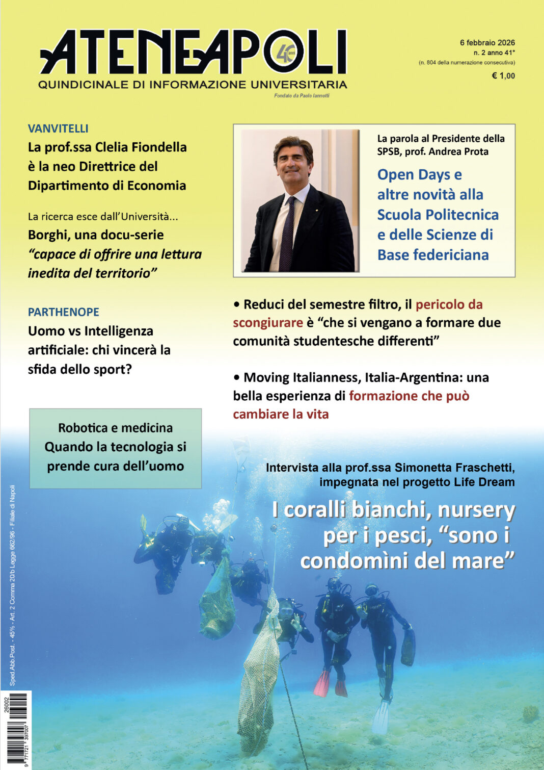 Giornale 2026 (anno 40°) Num. 2 di Ateneapoli del 6 febbraio 04/02/2026 0 348 Share FacebookTwitterWhatsAppEmailCopy URL Scarica GRATUITAMENTE il giornale in formato pdf Share FacebookTwitterWhatsAppEmailCopy URL Previous articleLuca Zenobi nuovo Coordinatore della Magistrale. “Vogliamo rafforzare i percorsi internazionali e lavorare affinché conducano al doppio titolo”Next articleMoving Italianness, Italia-Argentina: un’esperienza di formazione che può cambiare la vita Desk Due - Advertisement - Articoli Correlati Federico II Intervista al Presidente prof. Andrea Prota. Open Days e altre novità alla Scuola Politecnica 04/02/2026 Attualità Intervista alla prof.ssa Simonetta Fraschetti, docente di Ecologia. I coralli bianchi, nursery per i pesci, “sono i condomìni del mare” 04/02/2026 Federico II Robotica e medicina: quando la tecnologia si prende cura dell’uomo 04/02/2026 Parthenope Uomo vs intelligenza artificiale: chi vincerà la sfida dello sport? 04/02/2026 L. Vanvitelli È la prof.ssa Clelia Fiondella la neo Direttrice del Dipartimento di Economia 04/02/2026